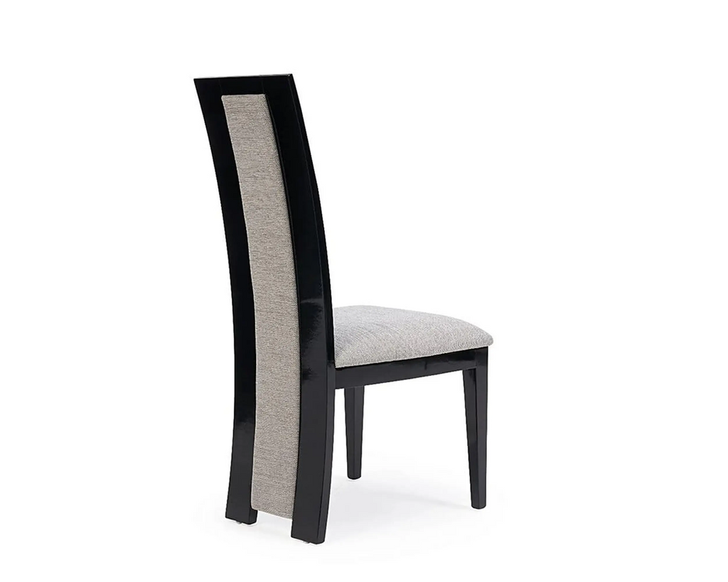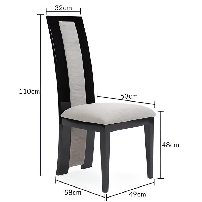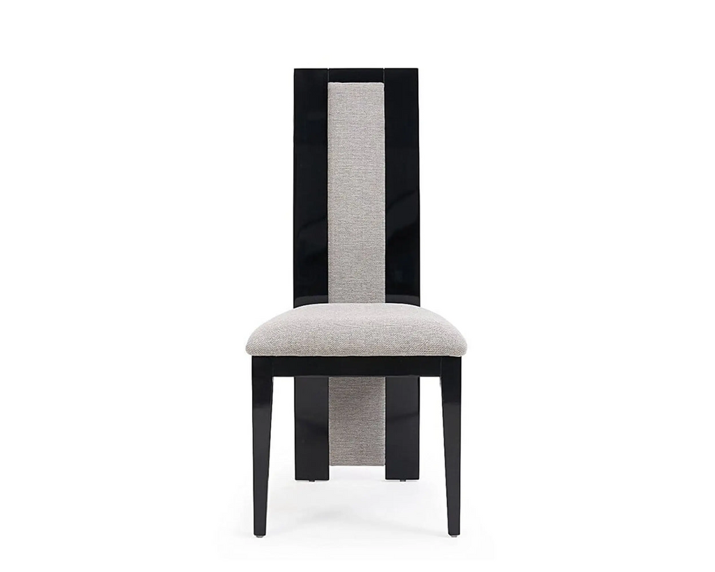 Elevate your dining space with this sophisticated set of modern dining chairs. Each chair features a striking high-back design with a distinctive grey fabric centre panel framed by sleek black sides, creating an eye-catching contrast. The chairs boast a comfortable 45cm x 45cm seat cushion with quilted upholstery and foam filling for optimal comfort. The durable metal frame with chrome finish provides excellent stability, whilst the 95cm total height offers proper back support. These chairs combine functionality with style through their rectangular shape and modern aesthetic.