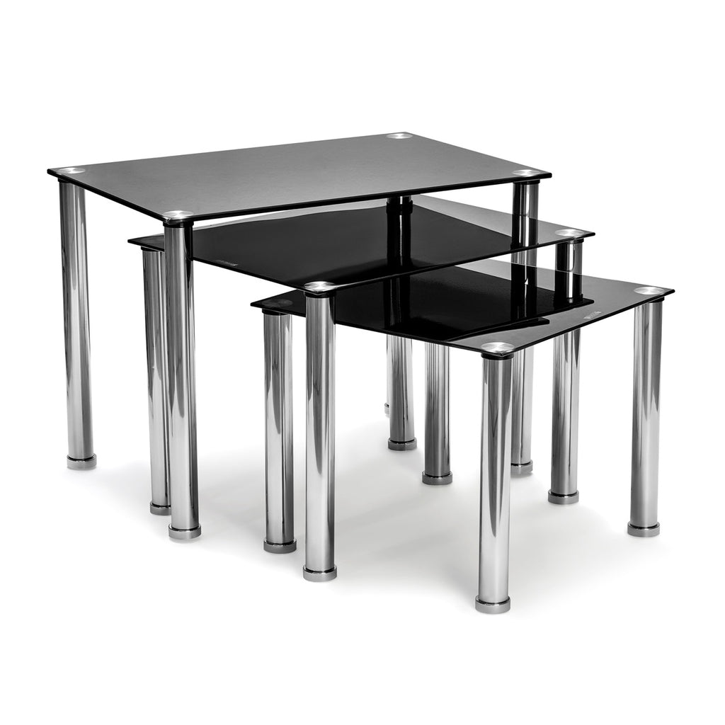 Rectangular shaped nest set of 3 tables  solid Metal legs as shown in pictures.   Can be use as side tables and telephone tables. Also please allow sometime to go for product dimension before your commit to purchase...