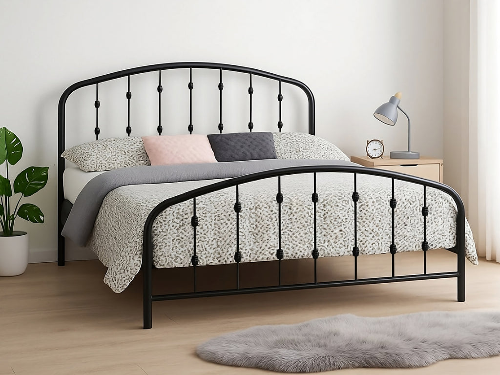 Crafted from high-quality powder-coated steel, the Mozart Bed Frame ensures long-lasting durability and stability. The arched headboard and footboard feature elegant rounded edges that keep bedding neatly in place, while the sleek matte black finish complements any décor. Its sturdy metal slat system provides excellent mattress support—no box spring required—offering both comfort and convenience.