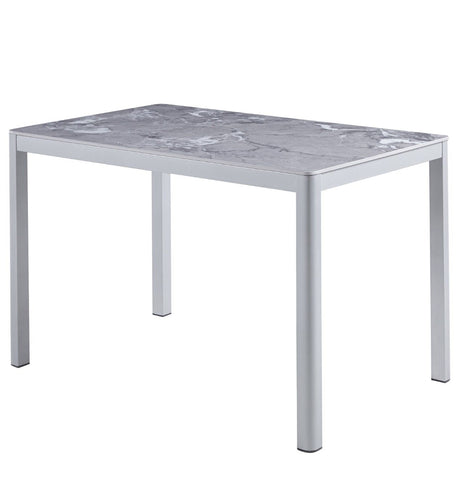 Budget Dining Table  Set Includes 4 Chairs Materials: Glass, Aluminium  Product Dimension:  Length= 123 cm  Width = 81 cm  Height = 75 cm    Rectangular Dining Table and 4 Faux Leather Dining Chairs with matching...